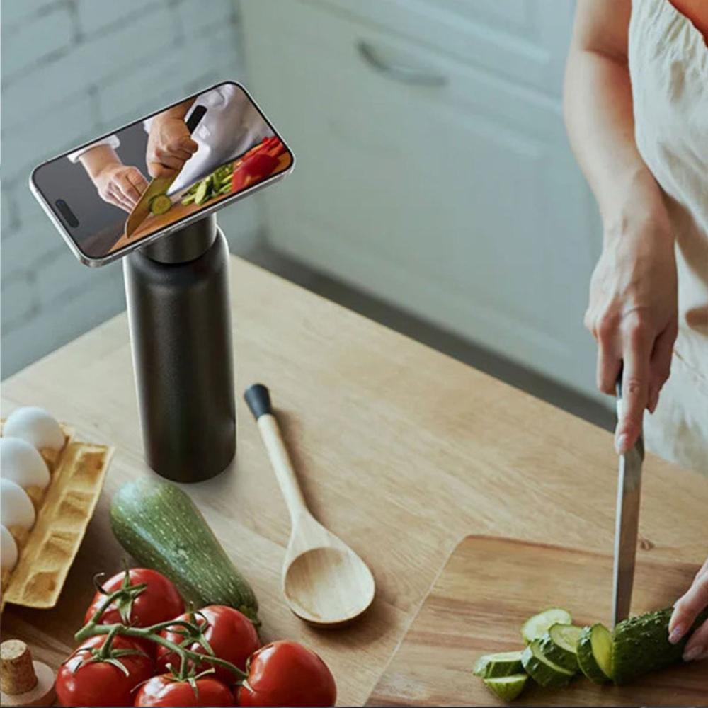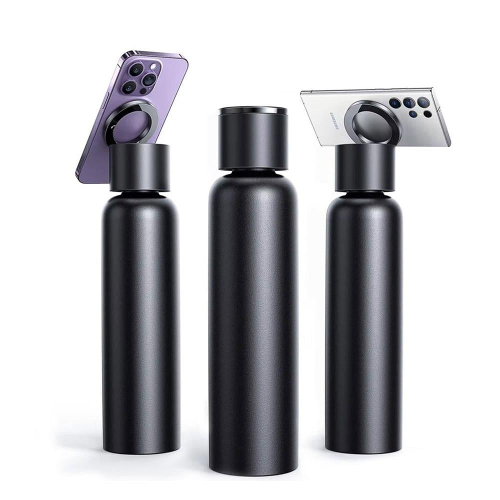 زجاجة مياه رياضية مزودة بحامل جوال مغناطيسي عملي، تجمع بين الترطيب السريع والوصول السهل لهاتفك دون الحاجة لوضعه جانبًا.